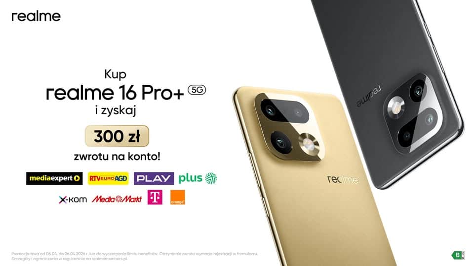 Promocja cashback jest dostępna dla kupujących smartfon realme 16 Pro+ 5G w terminie od 06.04 do 26.04.2026 r.