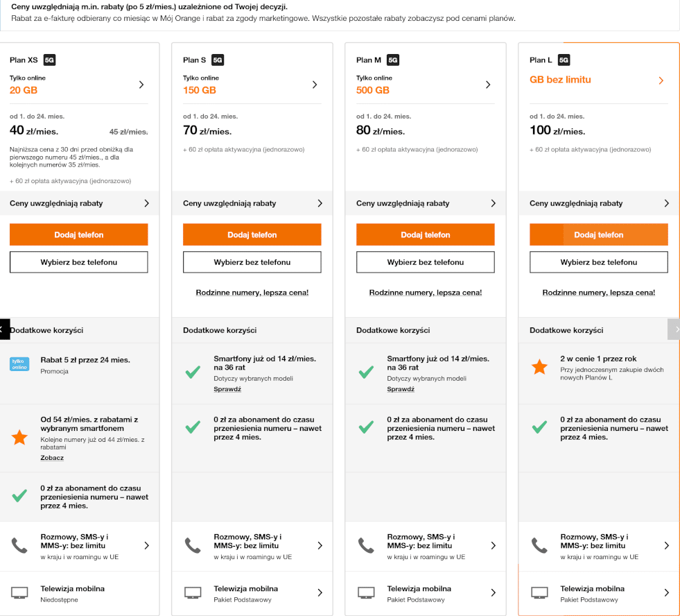 Podane ceny zawierają rabaty za e-fakturę odbierane co miesiąc w Mój Orange i za zgody marketingowe, każdy po 5 zł/mies.